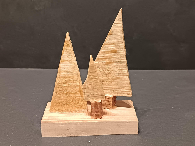 Les silhouettes triangulaires évoquent des sapins élancés, implantés sur une base qui suggère le sol forestier. Les variations de teinte et le veinage confèrent à l’ensemble une lecture naturelle et authentique, sans artifice. Le contraste entre les volumes verticaux et la base ancre la composition dans un paysage calme et structuré, inspiré des forêts de montagne.
